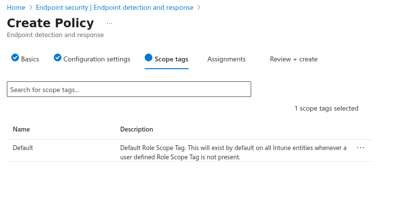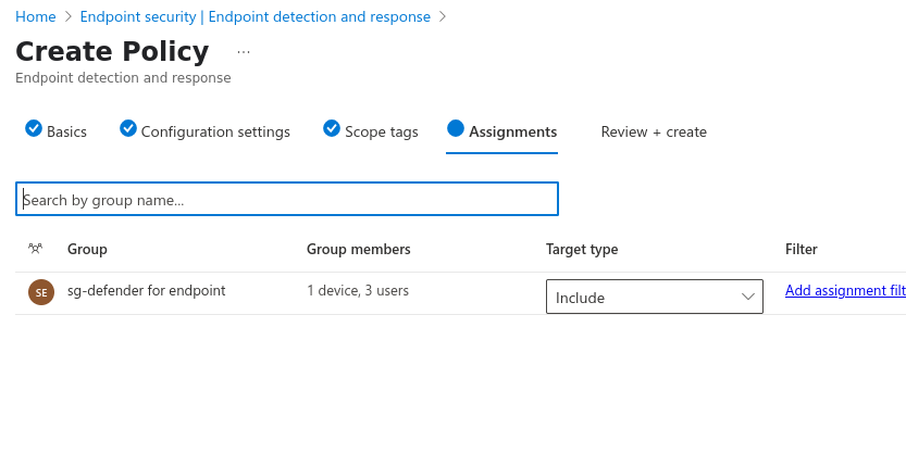 Nós vamos deixar marcado a opção Auto from Conector, como nosso defender esta integrado ao INTUNE ele vai pegar o pacote automaticamente do Defender e mandar para as máquinas. E vou deixar em All a opção Sample Sharing, que é compartilhar dados e amostras de ameaças com a Microsoft. Scope tags deixamos no default, e em atribuições incluímos o grupo “sg-defender for endpoint”, onde está nosso computador.