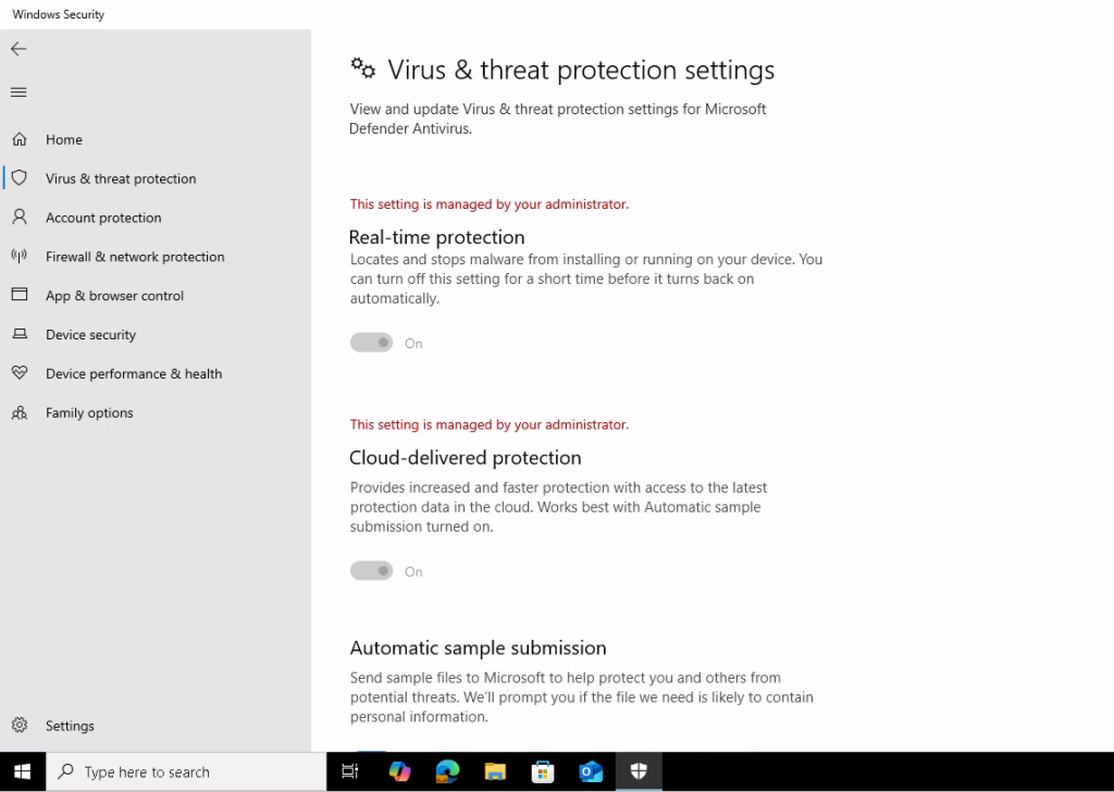 E por fim lá nosso computador, vamos verificar se tudo esta ok. Podemos ver no Windows Defender que o usuario não pode mais fazer alterações.