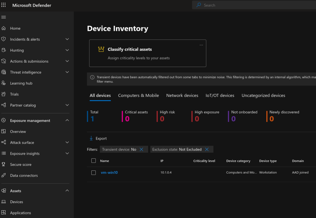 Após alguns minutos o computador já apareceu no portal no Defender em devices. E já podemos ver na política de EDR também.